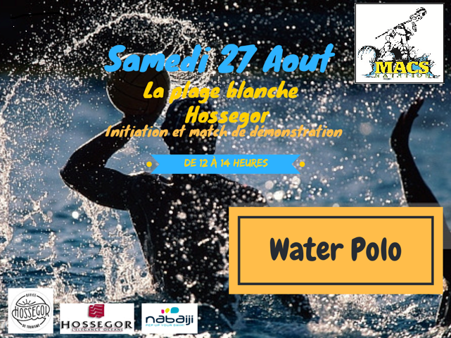 Samedi 27 aout 2016 de 12 h à 14 h, la plage blanche au Lac d'Hossegor, venez nombreux participer à une initiation et un match de démonstration de Water polo avec l'équipe de Macs Natation et l'équipe Nabaïji de St Jean de Luz !!!! Parlez en autour de vous !!!!